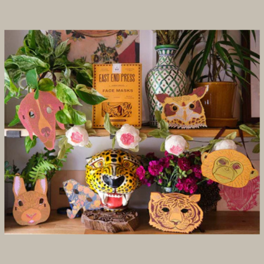 Our costume masks are screen printed on both sides on thick, handmade cotton paper. The recycled paper masks have two cut-out eye holes with securely attached ribbon on either end, making them ideal accessories for parties and fancy dress.