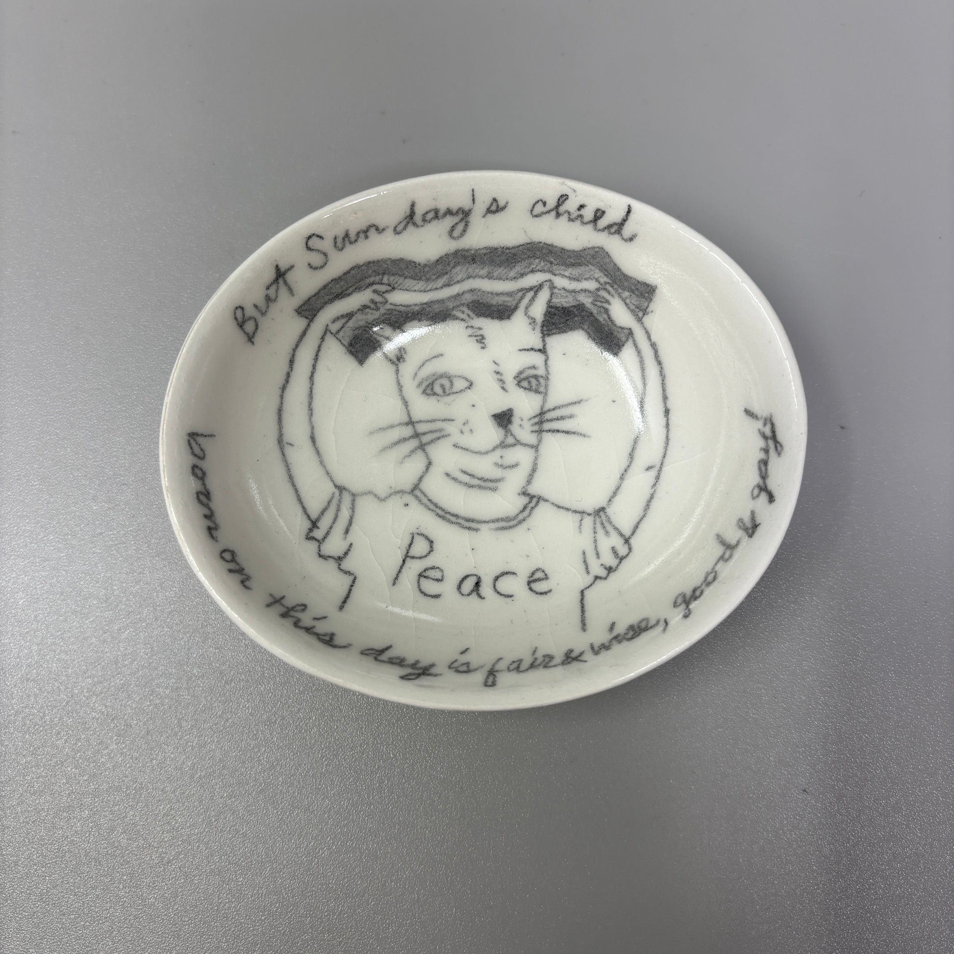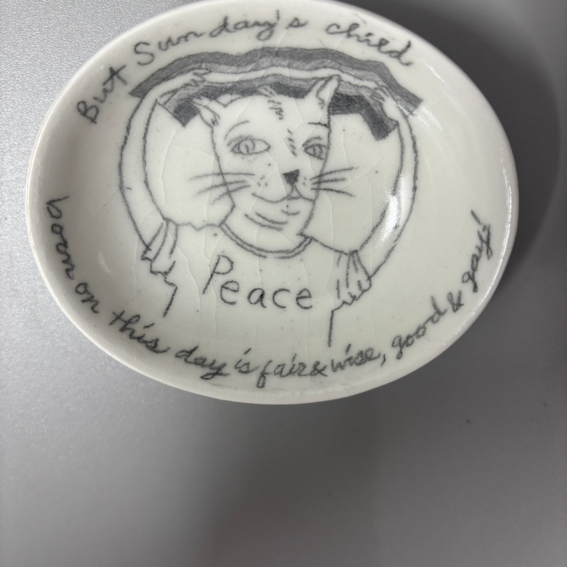 This charming hand made trinket dish is by Pbody Dsign. The “Monday’s Child” collection is a series of 7 trinket dishes, each with a rendering of a Caton an activity illustrating the redux of the fortune- telling nursery rhyme of the same name.
