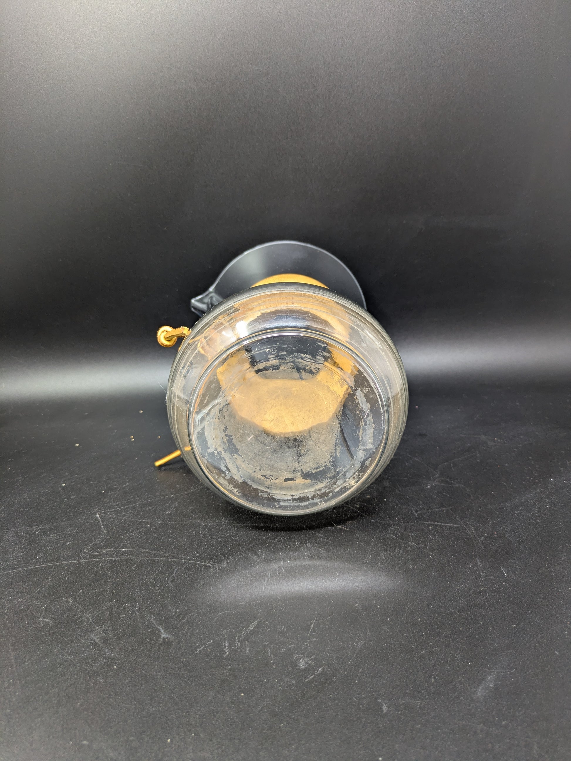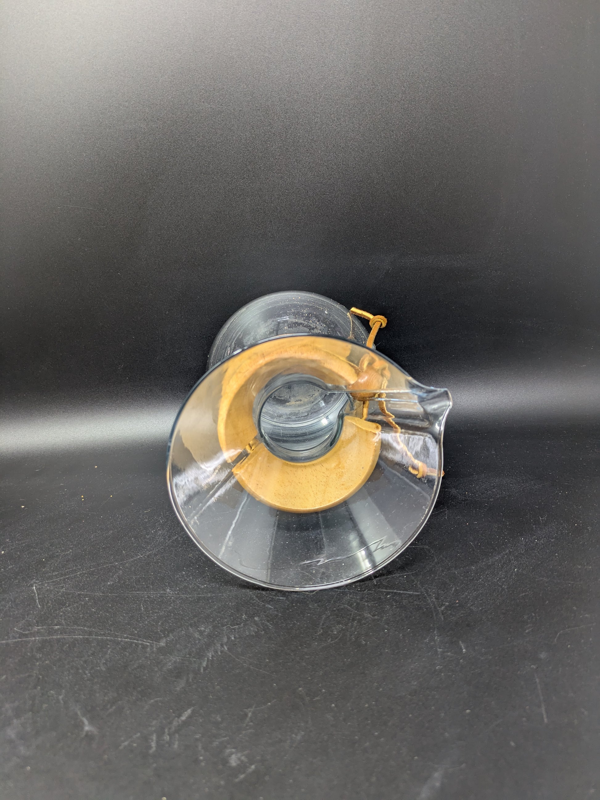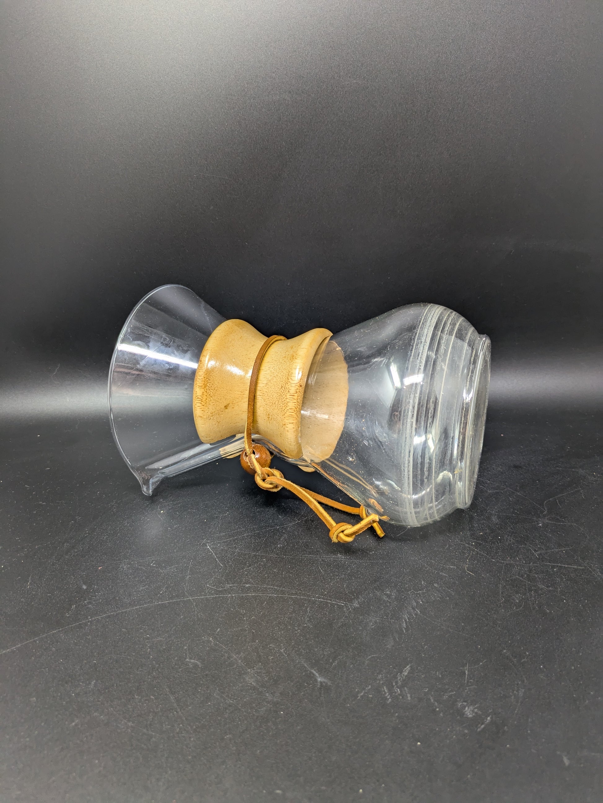 This Coffeemaker consist of a glass pitcher, two wooden accents pieces, and a leather string and wooden bead that holds the piece together. The item has some wear and inclusions, see photos for condition.