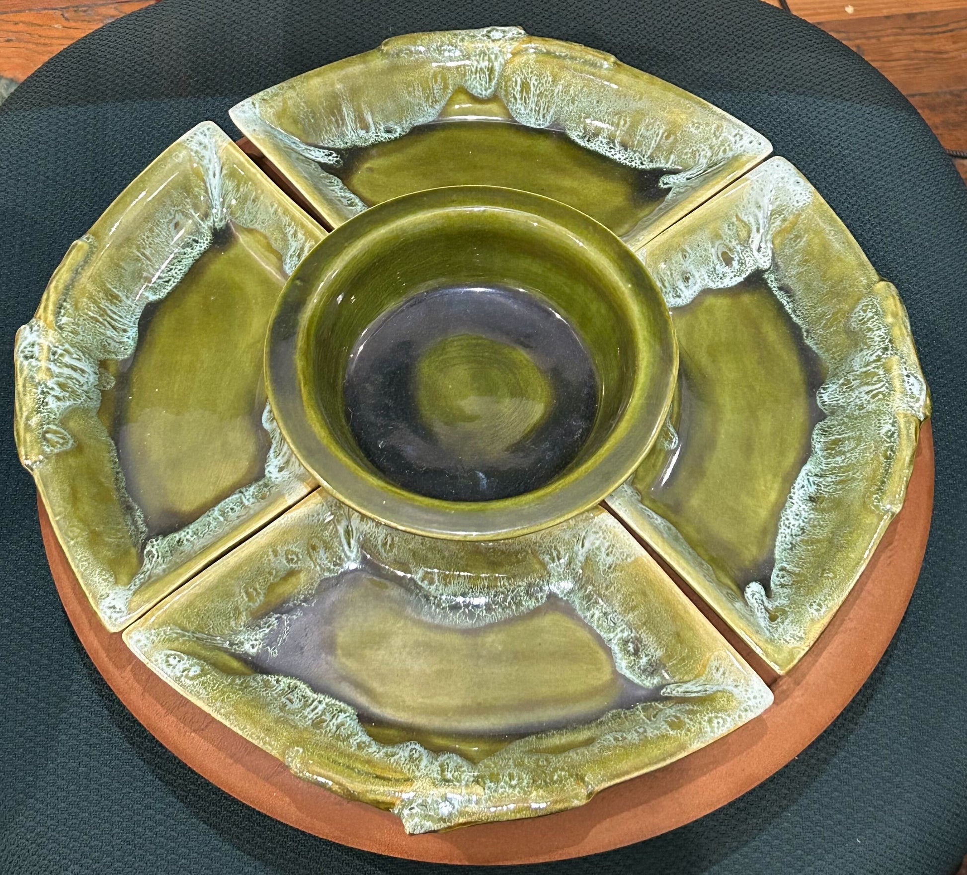 Mid-century modern California pottery ceramic chips and dip/crudité appetizer compartments on wooden lazy Susan.