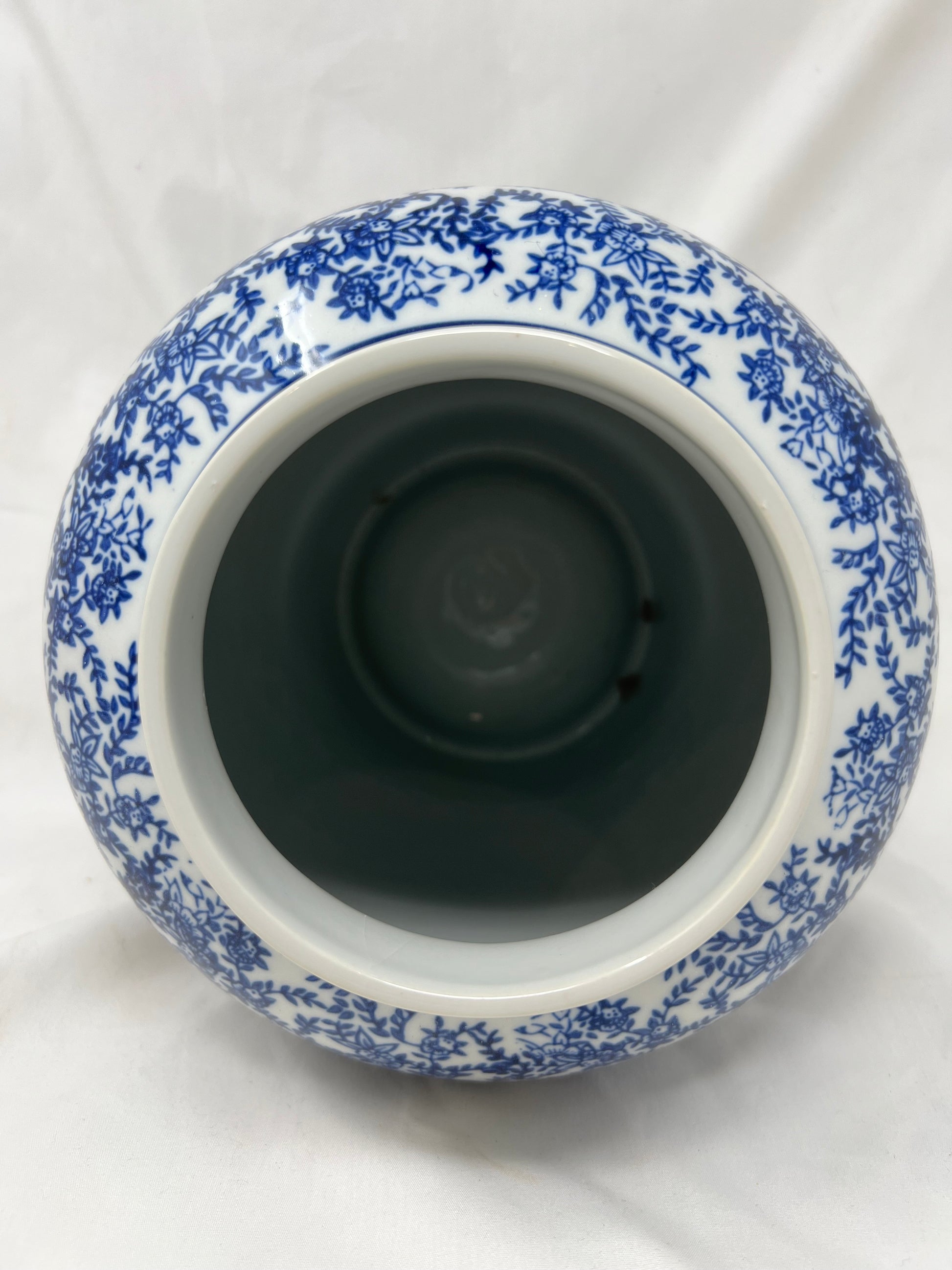 This traditional Ginger Jar makes a statement with its untraditional small flowering botanical vines. In the center on the front side is the Chinese symbol for Happiness.