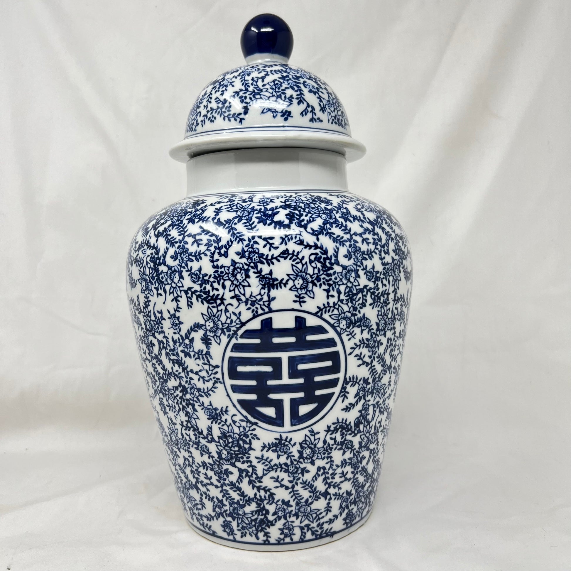 This traditional Ginger Jar makes a statement with its untraditional small flowering botanical vines. In the center on the front side is the Chinese symbol for Happiness.