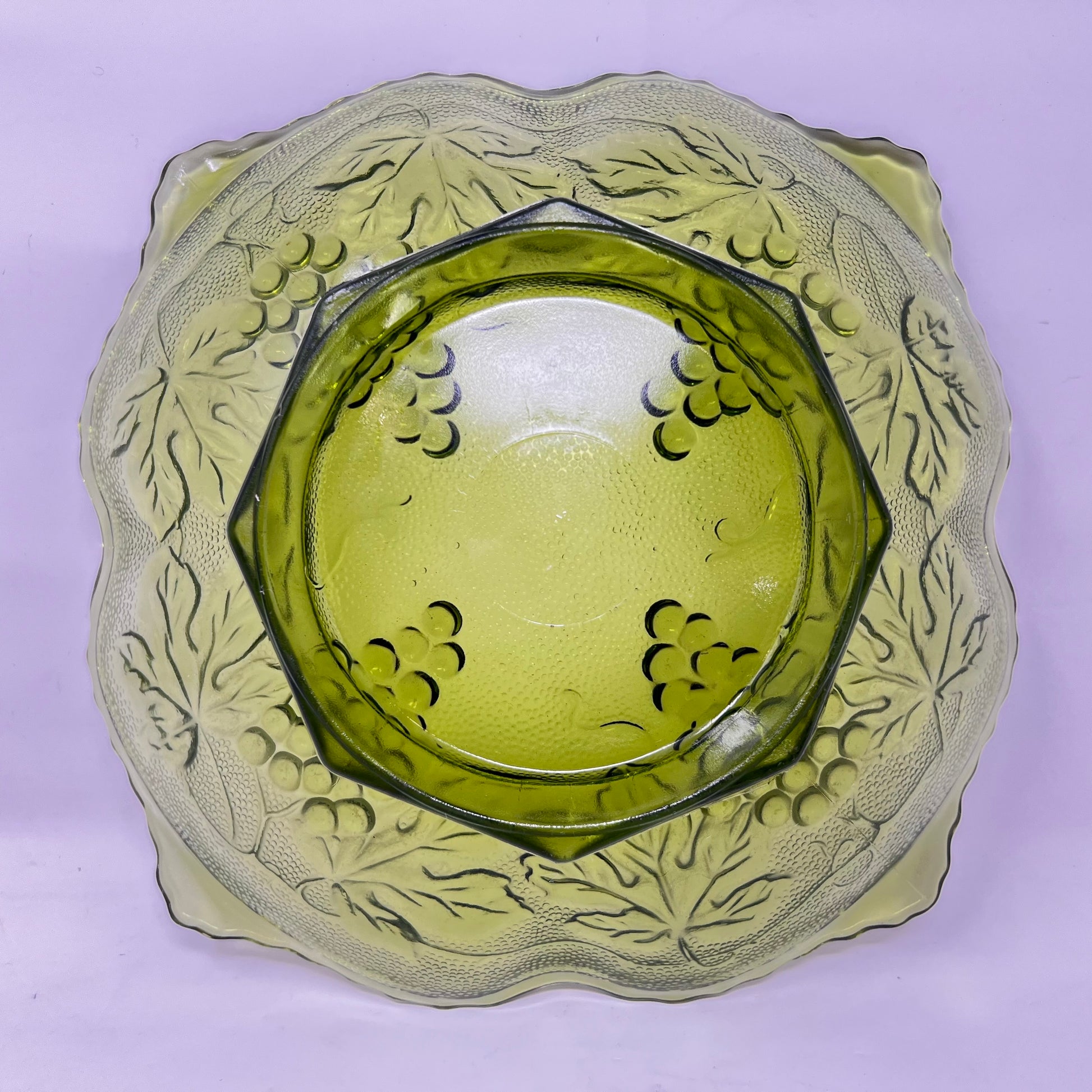 Here is a beautiful vintage Anchor Hocking green grapes and leaves footed glass bowl. Produced in the 1970s.It measures 9 3/4" diameter and 2 1/8" tall