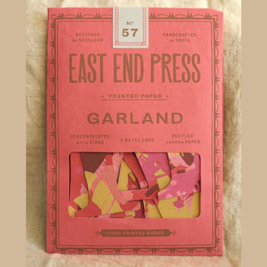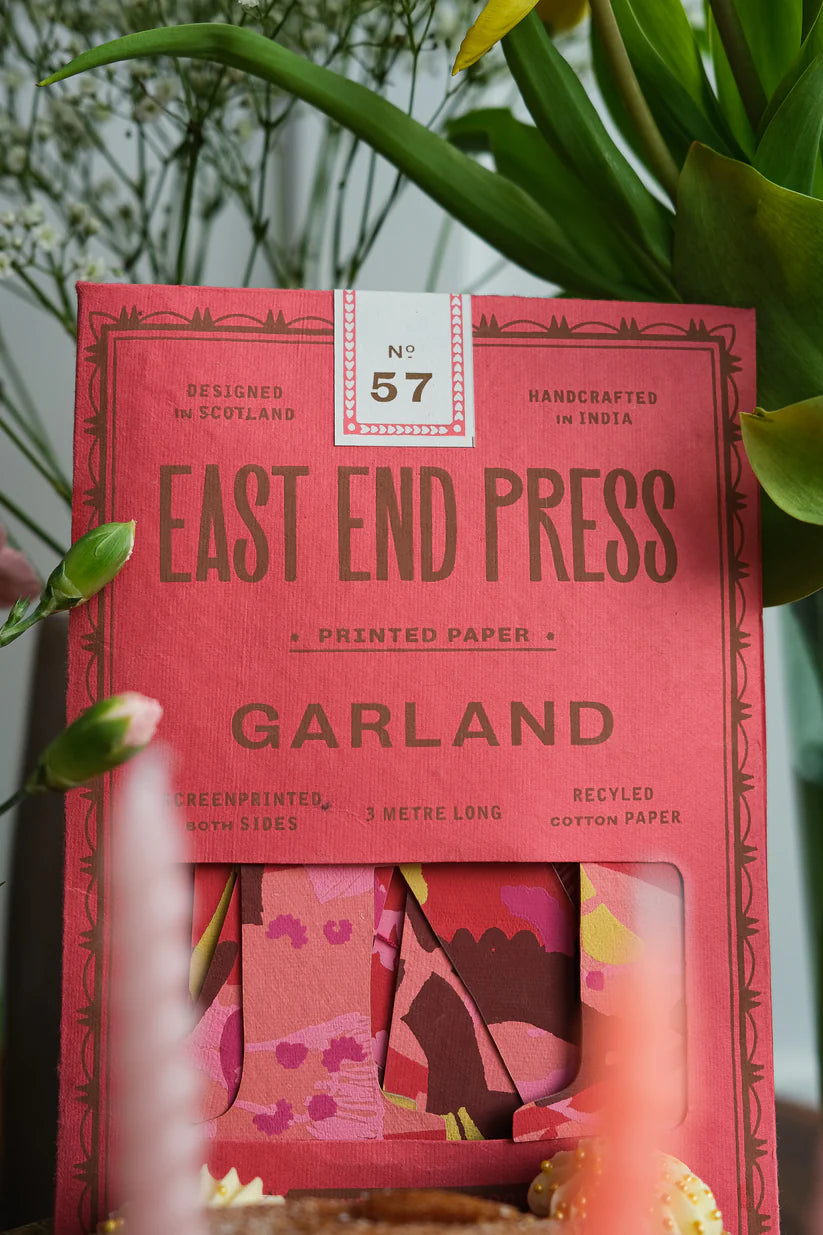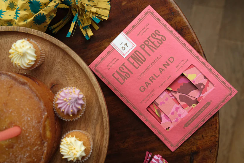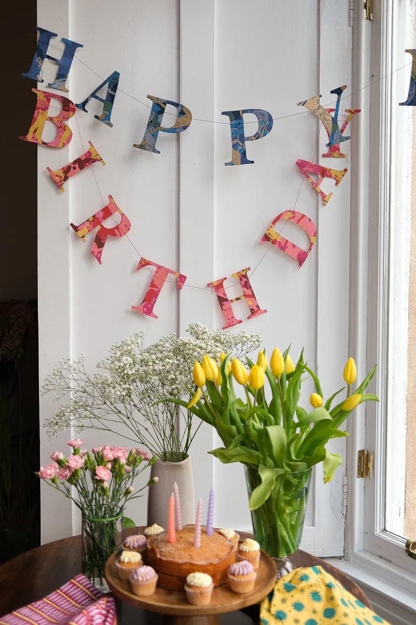 Made from recycled waste and test prints left over in the East End Press print studio, each of the thirteen letters that spell out Happy Birthday in this garland is completely unique, so colours and prints will vary.