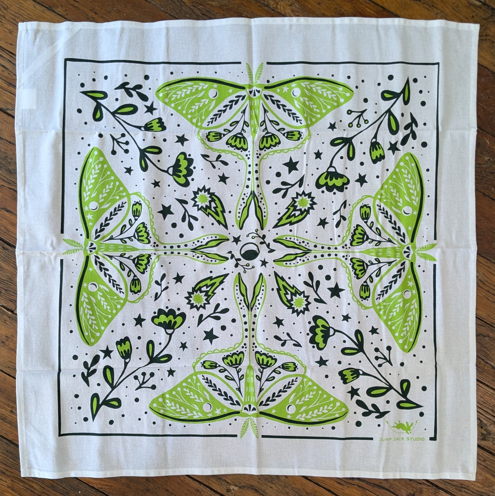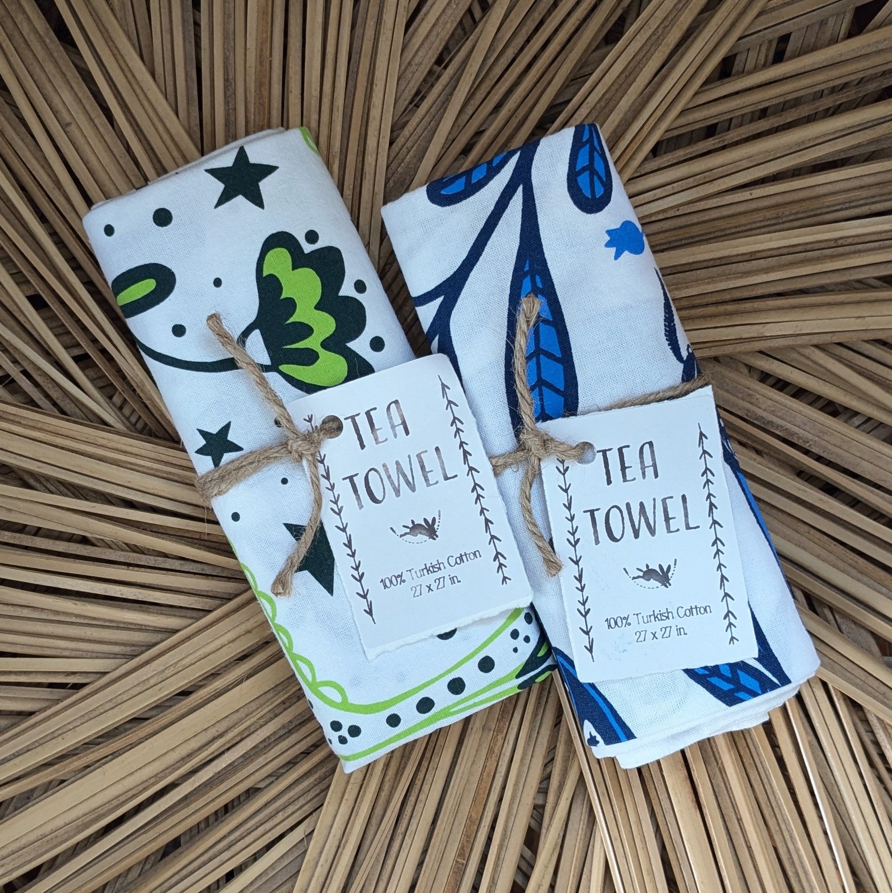 Jump Jack Studio 27" x 27" tea towels made of 100% Turkish cotton. White background with multi-colored botanical insect designs.