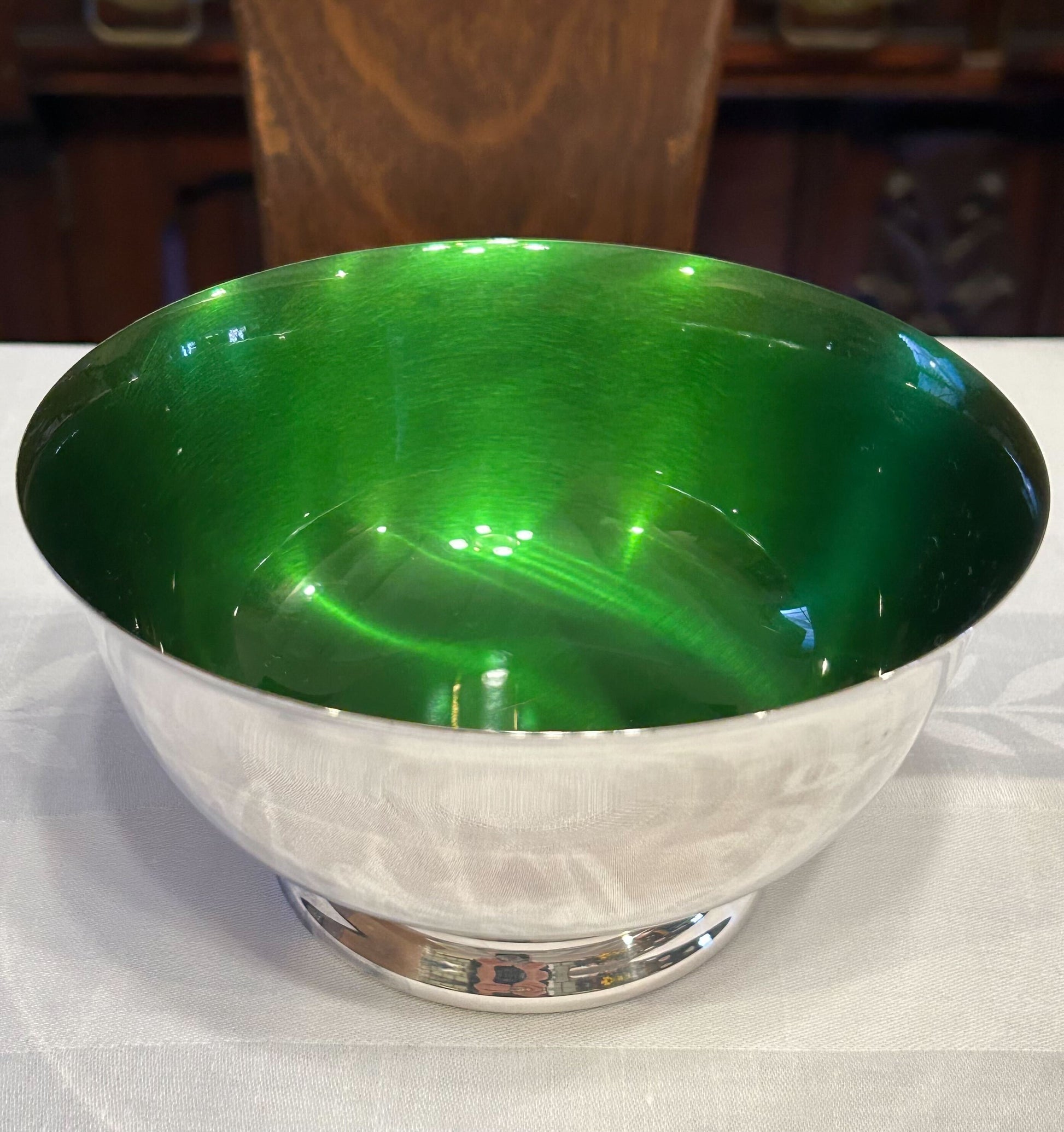 Vintage Mid-century modern Wallace Revere-style silverplate bowl with green enamel lining.