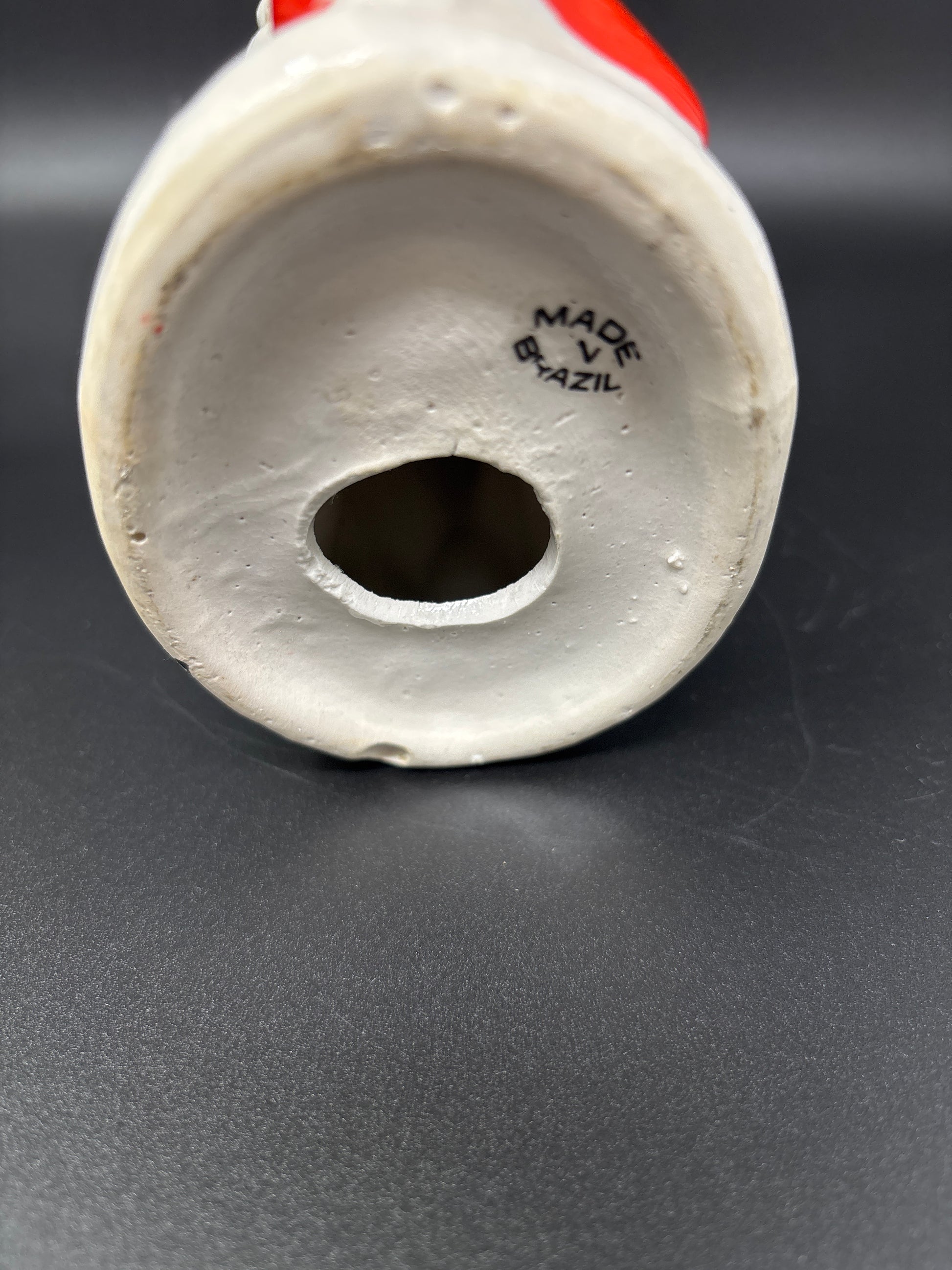 Charming pair of lusterware bird figurines with an orange pear by their feet. Hand painted. Stamped Made in Brazil on bottom.