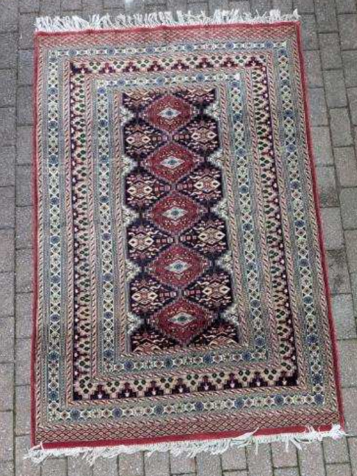 100% wool. Handsome rug in reds, blues, green, peach and camel.