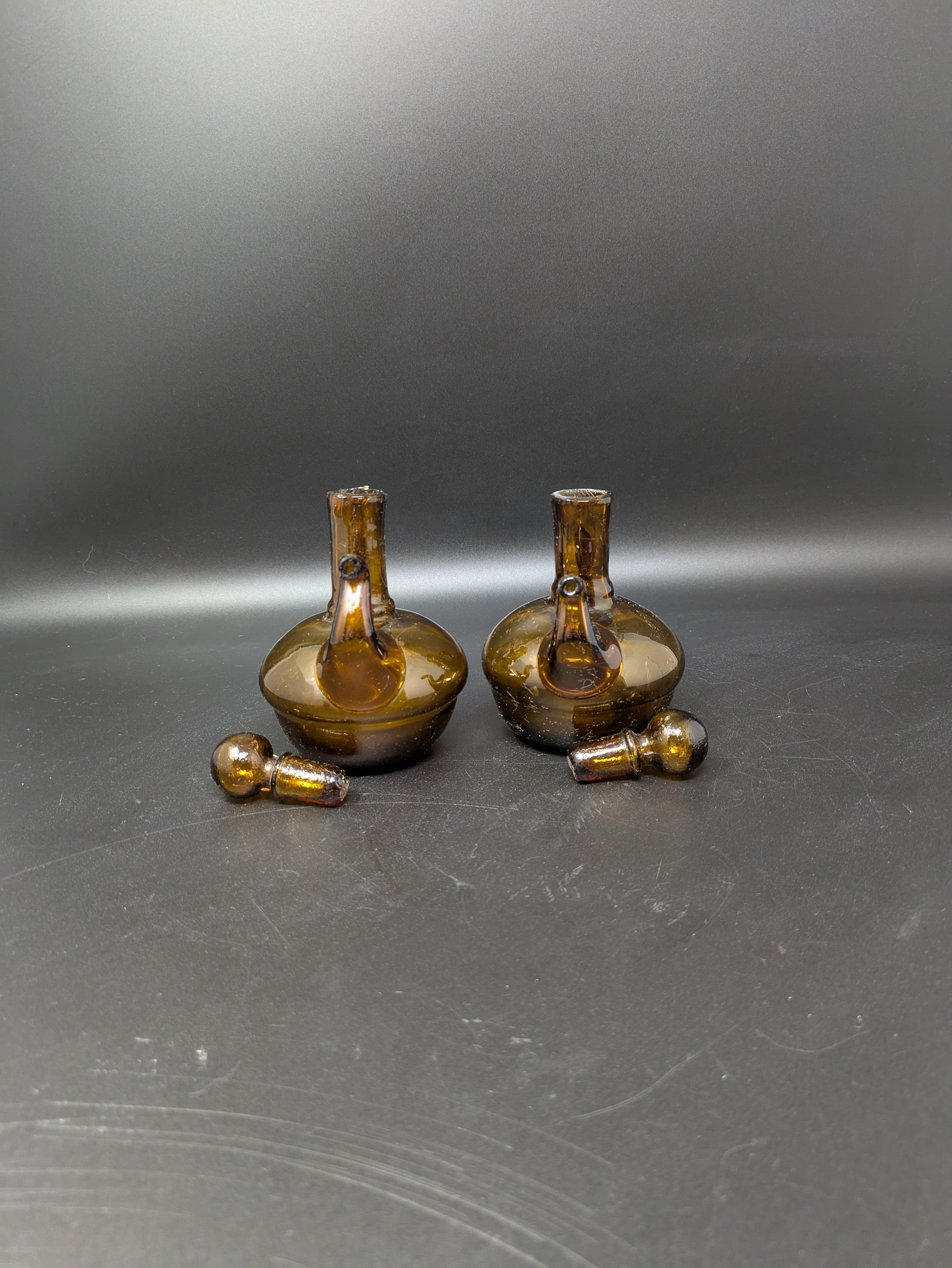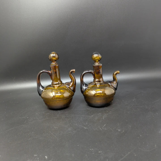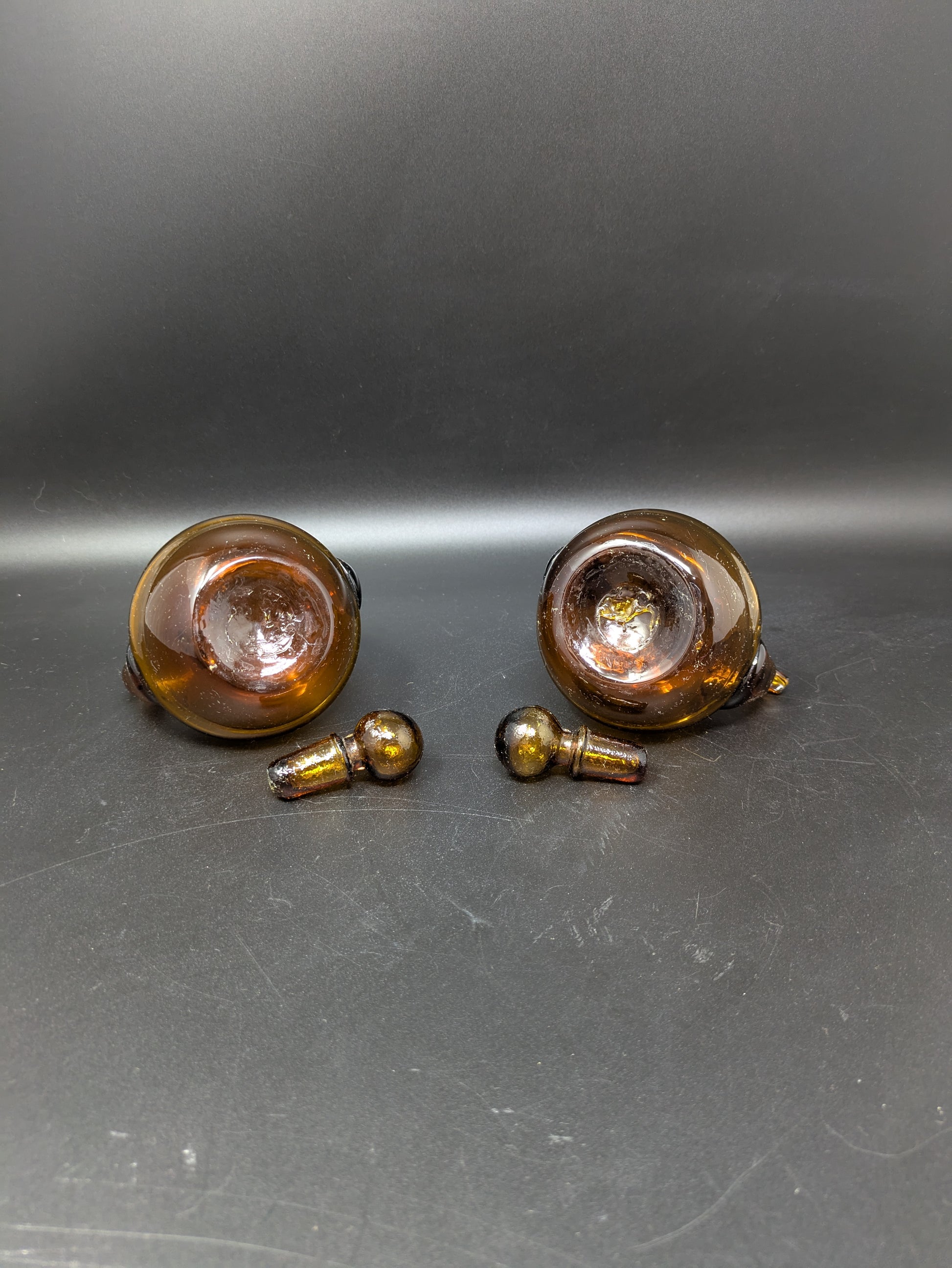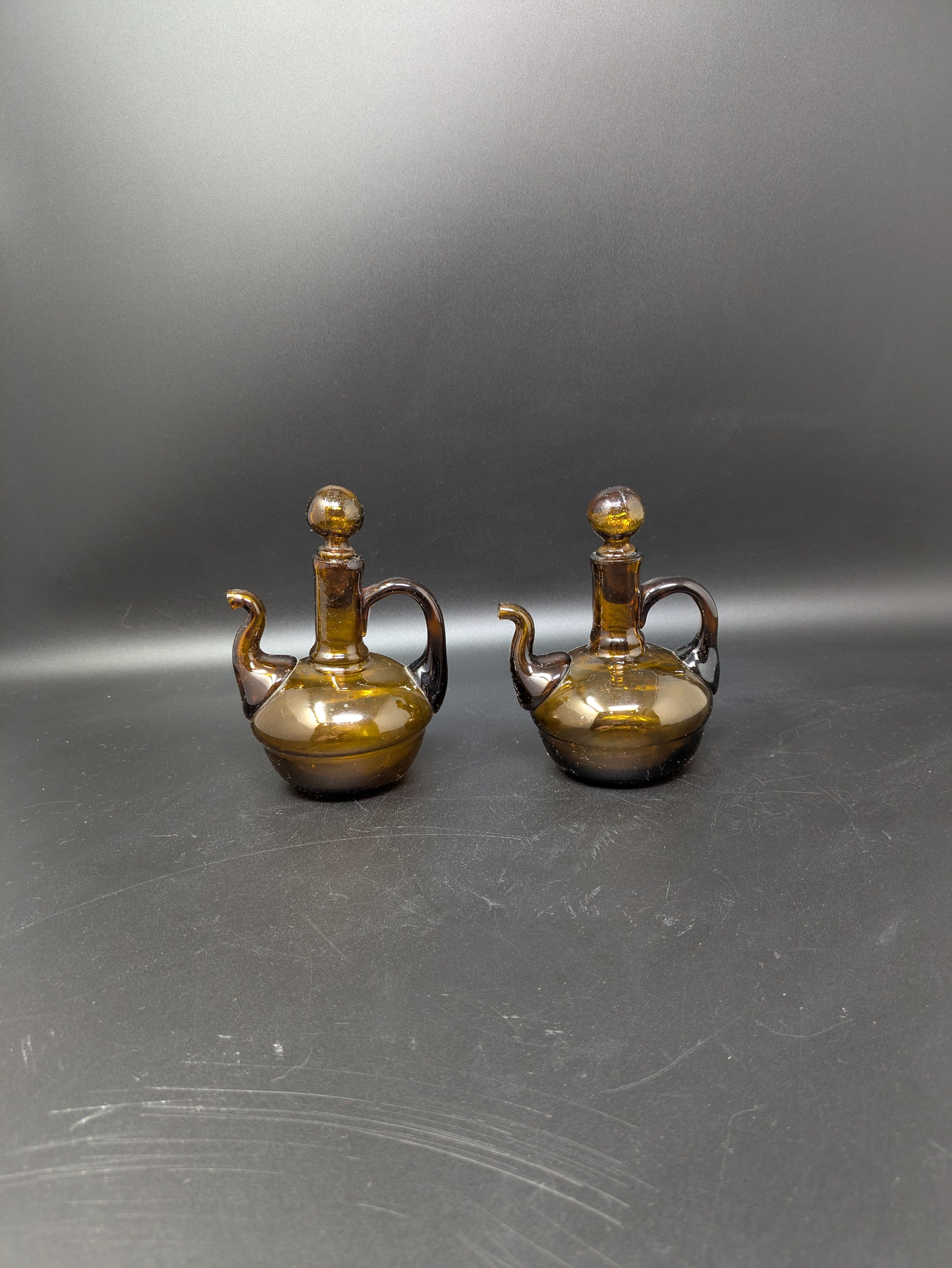 Vintage handblown cruets of amber glass in a set of two with glass stoppers and applied handles and spouts.