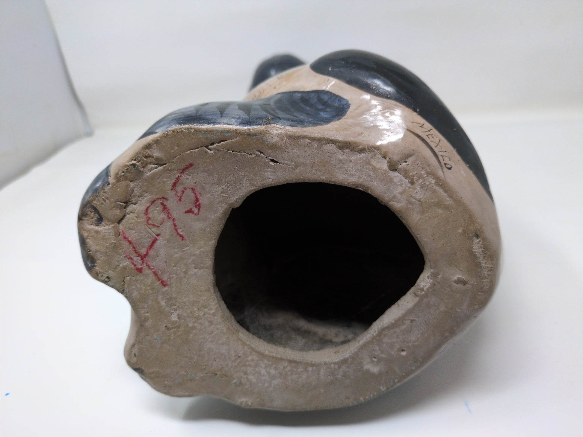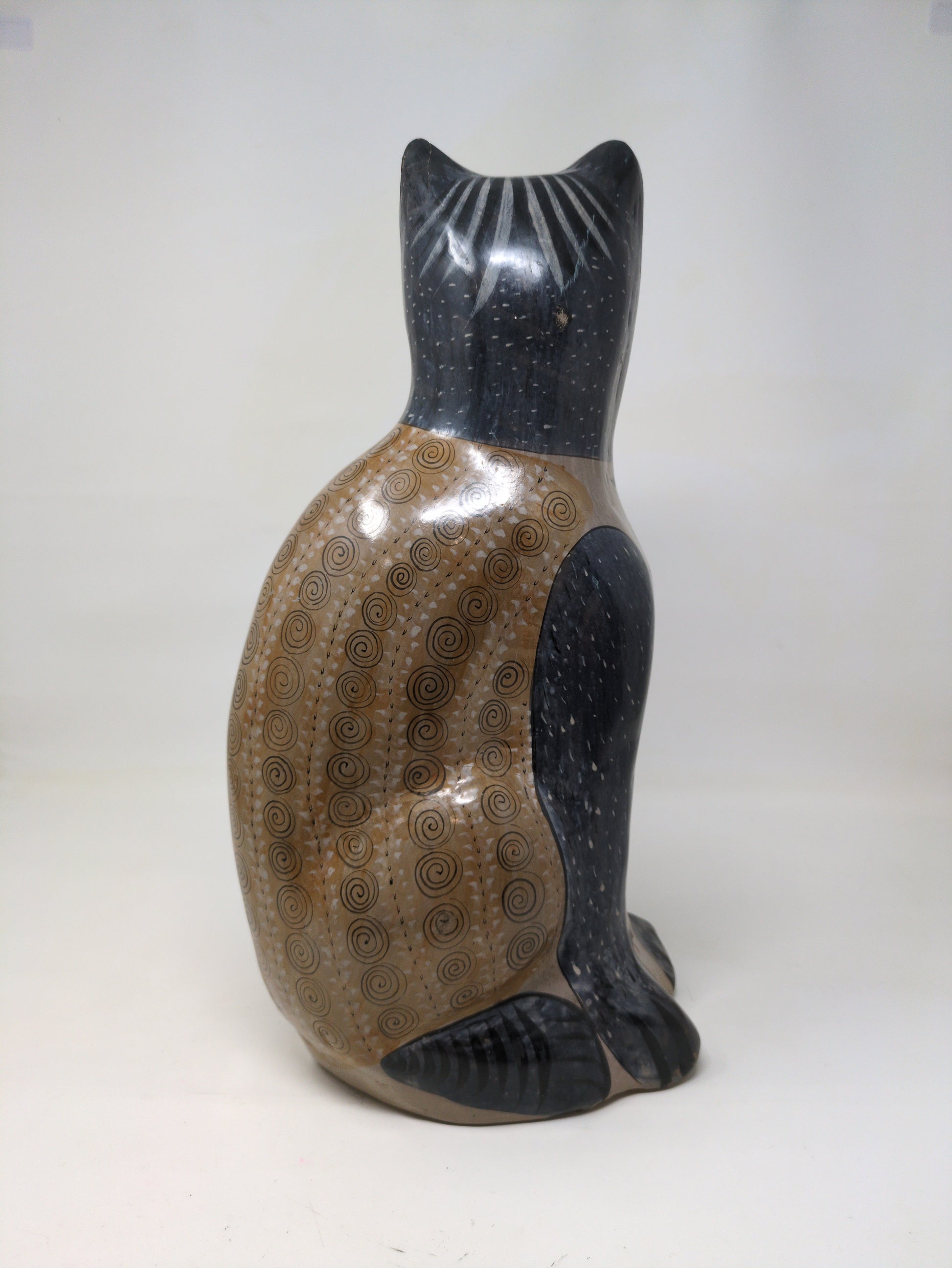 hollow Mexican folk art figurine of a cat with hand-painted designs