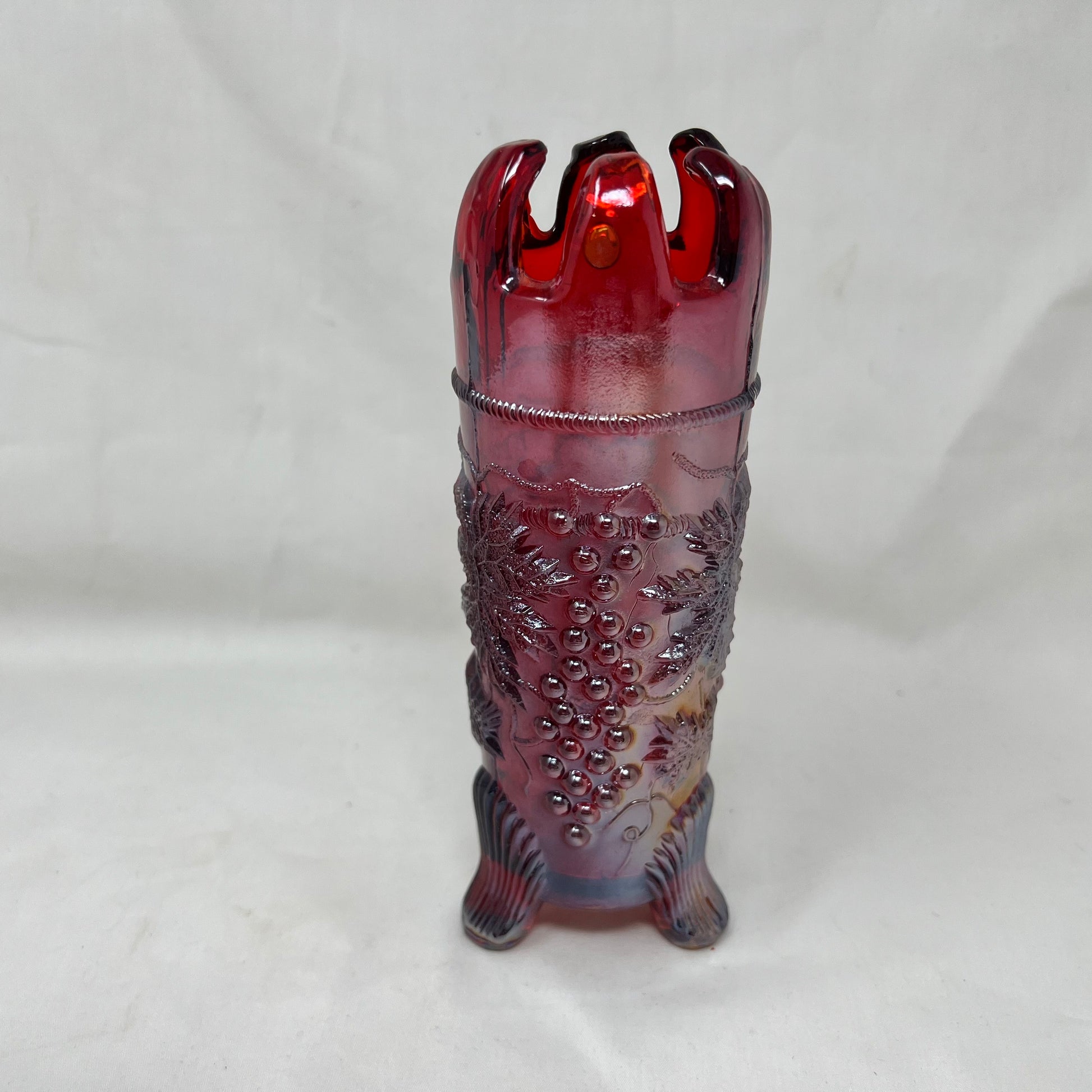 Iridescent Ruby Red Amberina Carnival GlassIt is a three-part mold blown grape pattern glass with applied iridescence.
